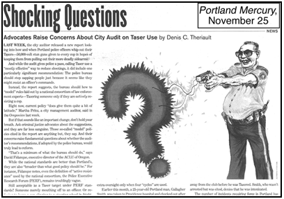 Unfortunately, despite good suggestions about further limiting the use of the electroshock weapons, the audit only asks limited questions about the appropriateness of deploying them. The report's narrow discussion about the possibility of fatalities could have been expanded by the Medical Examiner's September 2 finding that 87-year-old Phyllis Owens' death (PPR #51) was attributable to the 50,000 volt shock from a Clackamas County Sheriff's deputy affecting her pacemaker (Oregonlive, September 2). To their credit, the authors suggest requiring a higher threshold before Tasers can be deployed (an actual threat or physical resistance, not just intent to threaten or resist) and instructing officers not to use multiple shocks. However, they did not question whether using Tasers is appropriate for Portland Police. They instead absurdly concluded that Tasers were "effective" in all 50 cases examined because deadly force was not used, without asking if deadly force would have been justified in each instance--which is extremely unlikely. The auditors did not interview civilians who have been hit by Tasers, and ignored the hundreds of deaths after the use of Tasers around North America, including Portland's Timothy Grant (PPR #38). At least four other people have died after being hit by Tasers in Oregon--Nick Hanson in Ashland in 2006 (also PPR #38), Gregory Rold in Salem in 2009 (PPR #48), and Daniel Barga in Cornelius (PPR #50) and Ms. Owens in 2010. The audit also presumes the police point of view as fact. a) They repeatedly refer to Tasers (and other weapons) as "tools." This mindset leads to Tasers being used on a daily basis in Portland rather than rarely. b) They analyzed police reports for the 50 incidents, calling each situation "resolved" even though police did not explain how suspects received injuries. They do not mention whether complaints or lawsuits were filed. c) They use the term "agitated delirium"* throughout, which, while used by the Bureau, is not a real medical condition. It's a term that Taser Inc. started using to explain why so many people have died after use of Tasers. The report also contains inconsistent statistics on Taser use: previous reports have shown taserings in Portland remaining steady while other uses of force dropped (PPR #48). The Portland Mercury (Nov. 27, 2008) reported Tasers were used 541 times in 2006 and 476 times in 2007, yet the audit indicates numbers between 800 and 1000 for those years. In noting that the PPB stopped using the "Laser Sight only" checkbox on their Use of Force form, the report fails to weigh in on whether the City should return to this important practice. The audit also doesn't mention that 18% of cases in the City's two Use of Force Reports involved officers who reported no resistance or mere failure to comply with commands--nor why those incidents weren't investigated as misconduct. There is also no analysis of bullying tactics used by Taser, Inc. to quiet critics. Taser, Inc. goes out of its way to get jurisdictions not to blame their product for deaths, using billions they made selling their own stock. The Taser is a weapon that disables a person's motor skills using electricity. This is not a "tool." In late November, the Ninth Circuit Court of Appeals refused to revisit the finding in Bryan v. McPherson which found one particular Taser incident in California to be excessive force (PPR #50). Judge Kim Wardlaw blasted dissenting judges for "the largely unsupported and nonsensical belief that use of a device designed to fire a dart up to one-half inch into bare skin and deliver a 1200 volt charge somehow does not constitute an intermediate use of force." Meanwhile, an incident in Chicago that involved a medical examiner's determination that the Taser caused the death of Ronald Hasse in 2005 (PPR #36) led to a $550,000 settlement with Hasse's family in late July. Portland's audit is at http://www.portlandonline.com/auditor/index.cfm?c=51639&a=326891 . *The conventional term for this non-medically recognized condition is "Excited Delirium." |