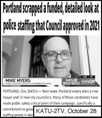 One exception to hopping on this bandwagon is KATU-2TV reporter Wright Gazaway. After Day's declaration (which supports the Portland Police Association and the people they endorsed for Mayor and City Council-- see "Rapping Back"), Gazaway reposted his 2021 news story quoting experts saying that population size and the number of officers are not the way to gauge how big a police department should be. He followed up with a story on October 28 revealing that a study commissioned in 2021 to figure out how many cops Portland needs-- especially with its unarmed alternatives such as Portland Street Response and the Public Safety Support Specialists-- was never completed. Deputy City Administrator for Public Safety Mike Myers said they put aside that study and never got back to it. Even before the Chief's plan was announced, houseless community newspaper Street Roots published a three part series showing that the number of officers on the street is not directly connected to crime rates (August 21).