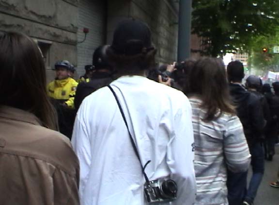 caught the officer's audio and what we think was his image on video, clearly angry. Overall, there was no sign that the officers intended to de-escalate the situation. As part of a group that sometimes organizes mass protests that receive permits (Peace and Justice Works) we are outraged that the police did not consult with the May Day organizers before sending in the riot squad and pulling the permit.